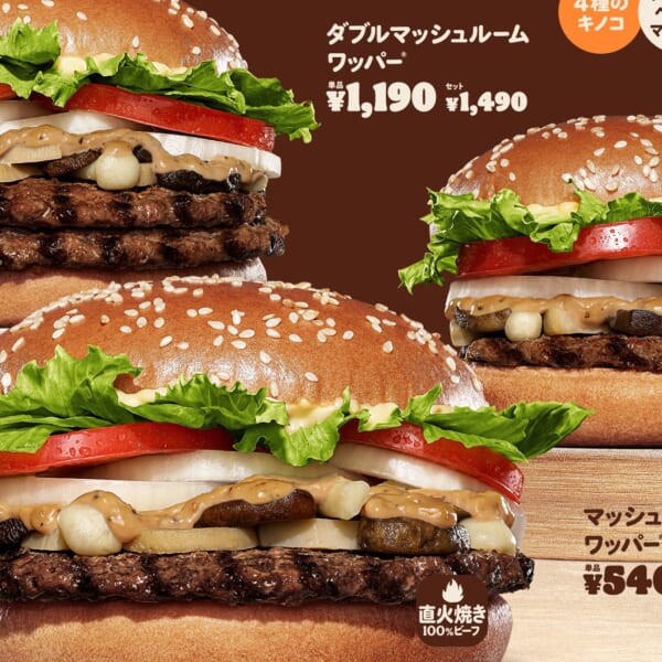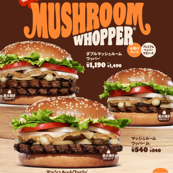 バーガーキング®︎から、4種のきのこと直火焼の100%ビーフパティに焦がし醤油の香りがアクセントとなったクリーミーな“プレミアムペッパーマヨソース”で仕上げた秋の風物詩的バーガー “マッシュルームワッパー®︎”、“ダブルマッシュルームワッパー®︎”、“マッシュルームワッパー®︎ Jr.”の3種が期間限定で復活。