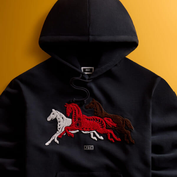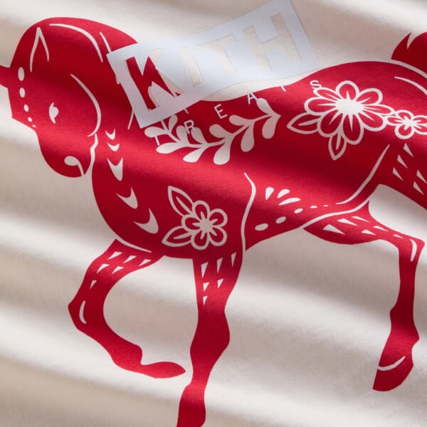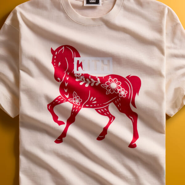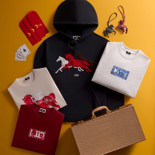 さらに、伝統的な中国のアイコノグラフィに着想を得たオリジナルアートワークを採用したグラフィックアパレルが全5型で登場。「Kith」のNelson Hoodie、Crewneck、そしてシグネチャーのTシャツには、今季の“Year of the Horse”仕様のKith Classic Logoと、ホリデーシーズンを想起させるイラストレーショングラフィックをあしらった。