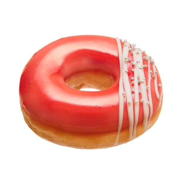 “ラッキー ストロベリー リング”は、新春らしい赤を基調に鮮やかな正月飾りをイメージ。ドーナツをミルキーなホワイトチョコで包み込み、その上からストロベリーピューレ入りのほんのり甘酸っぱいナパージュでコーティング。ホワイトチョコで線を描いた上にキラキラと光るアラザンをトッピングした、正月らしい華やかなドーナツに。