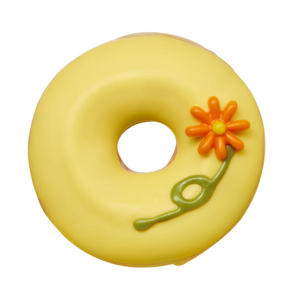 “フラワー カスタード”は、一輪の花が可憐に咲く様子を表現したドーナツ。人気No.1の“オリジナル・グレーズド®︎”をカスタード風味のコーティングで覆って春らしいカラーに。オレンジ色のお花モチーフのチョコレートのオーナメントを添えてドーナツに花を咲かせ、抹茶コーティングで茎を描いて彩りを添えている。