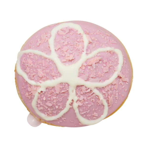 “Happy flowers”と題した今回は、満開の桜と可憐な一輪の花が咲くフラワードーナツ2種を展開。満開の桜をイメージした“サクラ クリーム“は、桜の香りがふわっと香る、桜風味のクリームが詰まったドーナツを、鮮やかなピンク色のルビーチョコ入りコーティングで覆い、桜風味のシェイブチョコをオン。仕上げにミルキーなホワイトチョコで、桜の花びらを描いたドーナツに。