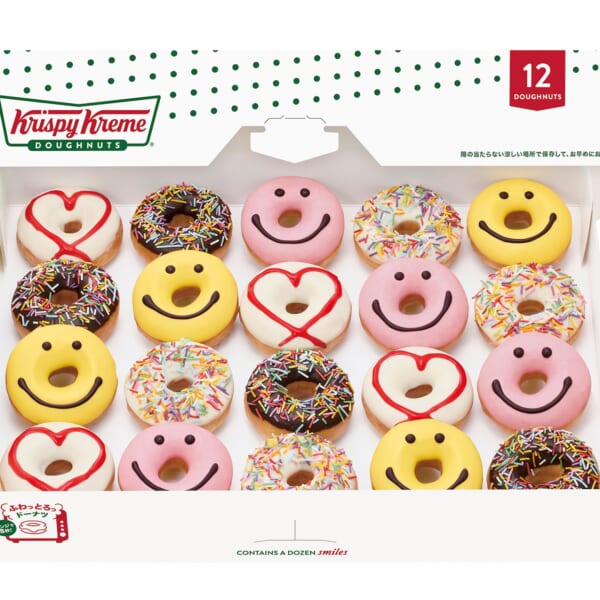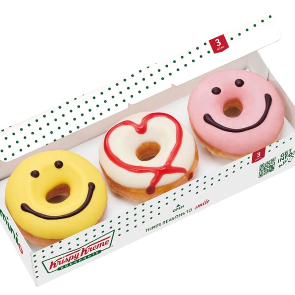 ミニ スマイル プリンは、キュートなスマイルを描いたミニ ドーナツの定番フレーバー。ミニオリジナル・グレーズド®︎に施したプリン風味のコーティングで、優しい味わいに。ミニ ストロベリー ハートは、ミニオリジナル・グレーズド®︎にホワイトチョコをコーティングし、赤い糸をイメージした可愛らしいハートをツヤっとしたストロベリーナパージュで描いた、まさにバレンタインにぴったりのドーナツ。