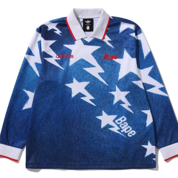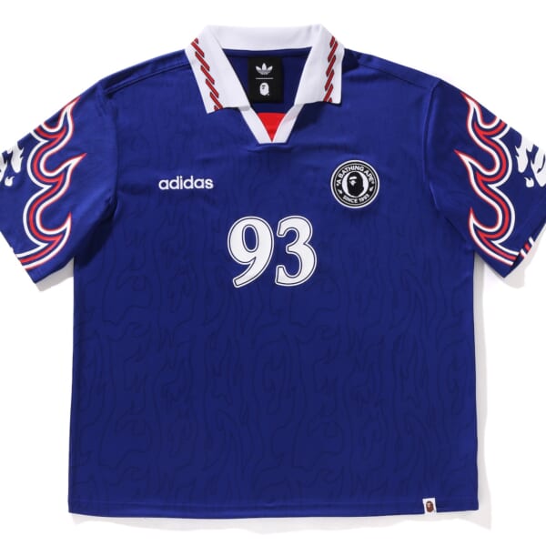 新たに共同制作したCAMO PRINT(カモ プリント)や印象的なグラフィックなど、〈BAPE®︎〉の大胆な美意識を随所に取り入れたコレクションに。アパレルは、2種類のサポーターユニフォームを用意。1つ目は、BAPE STA™︎グラフィックと両ブランドのアイデンティティを融合させたディテールが目を惹く、デニムプリントの襟付き長袖ユニフォーム。もう一方は、1990年代の日本代表チームのユニフォームを再解釈し、袖に個性的な〈BAPE®〉のフレイムグラフィック、背面に〈BAPE®〉の創業年を表す“BAPE 93”の文字を配したものとなる。さらに、これらに加えて、Tシャツ、フルジップフーディ、デニムジョーツ、パンツが登場する。