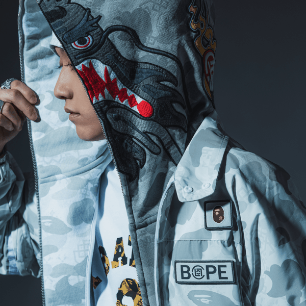 〈BAPE®︎〉を代表するシャークフーディは、〈CLOT〉ならではのカルチュラルな視点から再解釈。“Silk Royale”パターンと“1ST CAMO”を大胆に切り替えたスプリットカラーデザインで、強烈なコントラストを生み出した。さらに、フード部分には精緻に刺繍されたドラゴンモチーフをあしらい、力強さと繁栄の象徴を表現。文化的な奥行きを加え、伝統と革新を融合させた存在感のある1着に。