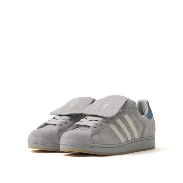 カラーは、深みのあるDGH SOLID GREYと、都会的で研ぎ澄まされた印象のCLEAR ONIXの2色展開。いずれも異なる表情を持ちながら、スタイリングを選ばず、足元に確かな存在感をもたらしてくれる。アッパーには、全体を包み込むように上質なスエード素材を採用。アイコニックなシェルトゥにいたるまで同素材で仕上げることで、SUPERSTARの象徴的なフォルムに新たな質感と奥行きを添えている。