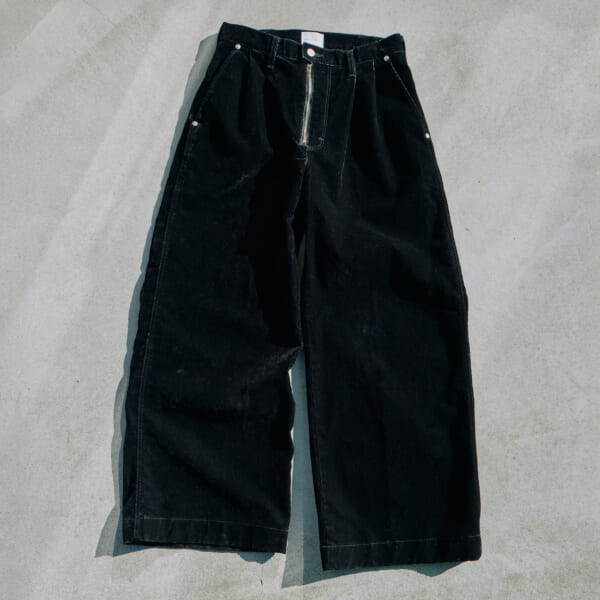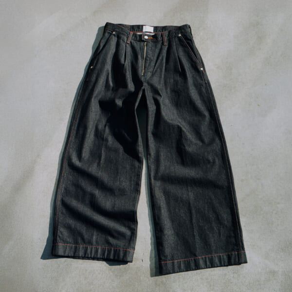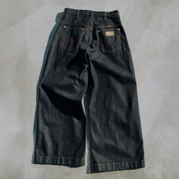 〈CamphorWood〉定番の2タックワイドバギーフレアスラックスをベースに、〈Wrangler〉のブロークンデニムに落とし込んだワイドトラウザーズは、ZIPを剥き出しにしたフロントが特徴的。ジャケットとのセットアップとしてはもちろん、単体でも成立する存在感のある1本に。ヒップポケットのフラッシャーには、〈Wrangler〉の“COWBOY CUT”と〈CamphorWood〉のロゴを融合したオリジナルグラフィックを採用した。