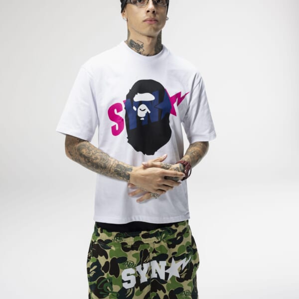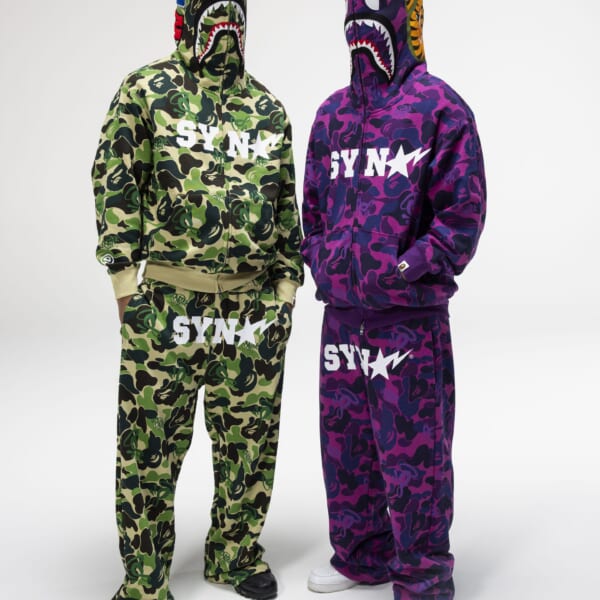 具体的には、ヒップホップカルチャーアイコンとなった“パープルのBAPE®︎フーディ”に着想したアイテムがラインアップ。パープルのCAMOを軸に〈SYNA〉のロゴを重ねることで、〈BAPE®︎〉の象徴への敬意を込めつつも、本コレクションのための新たなCAMOを生み出した。
