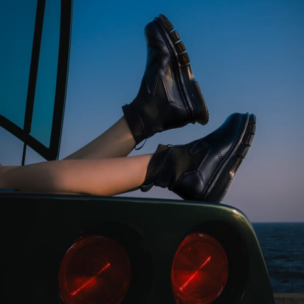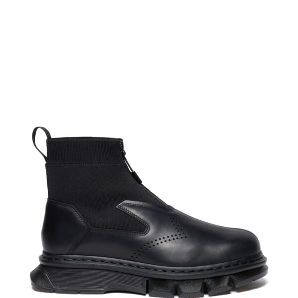 一方、ジップブーツは、レザーとニットソックスを組み合わせ、フロントに控えめなジップを配し、着脱のしやすさを実現。ユニセックス展開の両モデルは、ブラック・オン・ブラックのウェルトステッチでアウトソールに固定し、モノクロのAirWairヒールループで仕上げている。
