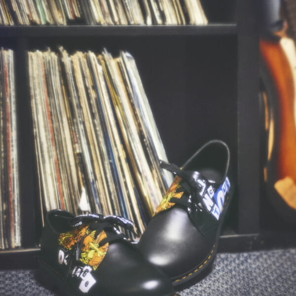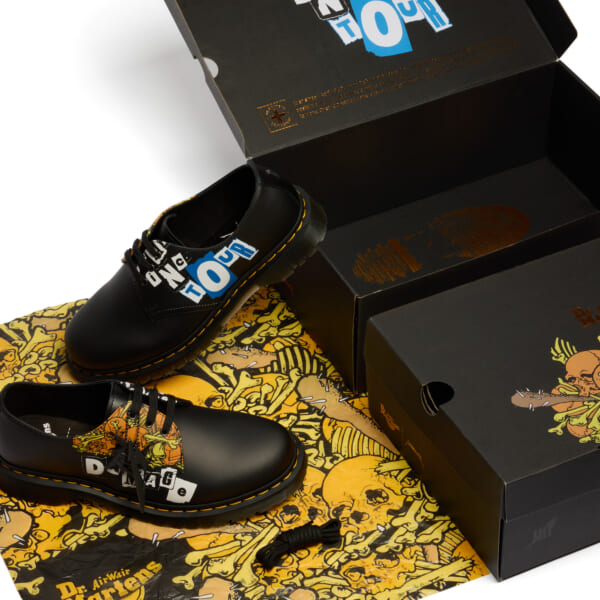 3ホールのTHE 1461 SHOEは、1986年<Damage Inc.>ツアーのアートワークをプリントし、トレッドが特徴的なBENソールを採用。ブランドの象徴的なイエローウェルトステッチで仕上げた。さらに、THE 1460 BOOT同様、タリカの“M”ヒールスタッズ、スペシャルエディションのドッグタグ、そして“Boredom comes from a boring mind(退屈は退屈な心から生まれる)”とプリントされたフラットレースに加え、ブラックラウンドレースも付属する。