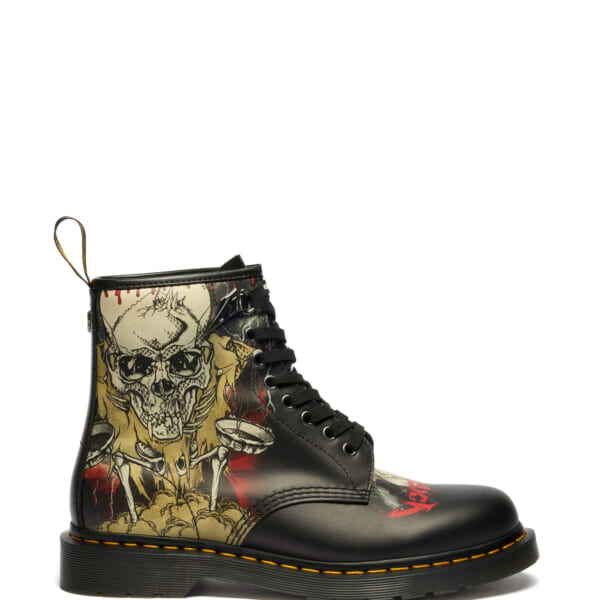 8ホールのTHE 1460 BOOTは、耐久性に優れたBackhandレザーに、1988年<Damaged Justice>ツアーのアートワークをプリント。アウトソールには、〈Dr. Martens〉のクラシックなDMSソールを採用した。メタリカの“M”ヒールスタッズ、スペシャルエディションのドッグタグ、そして“Boredom comes from a boring mind(退屈は退屈な心から生まれる)”とプリントされたフラットレースに加え、ブラックラウンドレースも付属。気分に合わせて付け替え可能なモデルに仕上げている。