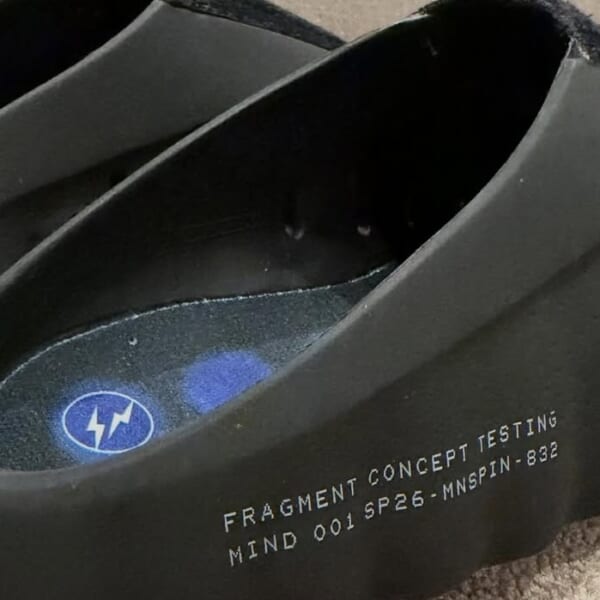 今回、“心地良いスリッパ”のテキストとともにお披露目された〈fragment design〉とのコラボモデルは、マットな質感が印象的なオールブラック仕様の1足となる模様。トゥ部分にはシルバーのサンダーボルトロゴ、サイドには“FRAGMENT CONCEPT TESTING MIND 001 SP 26 – MNSPIN – 832”の文字をあしらっている。