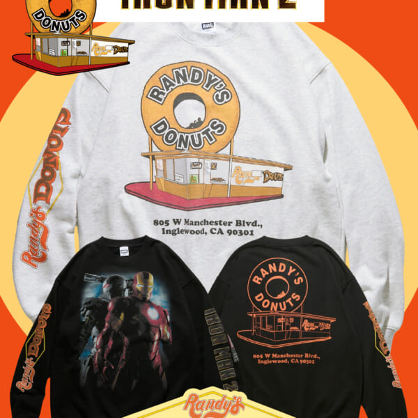 さらに、フロントには、アイアンマンとウォーマシンがデザインされた『アイアンマン2』のキービジュアルをオン。加えて、両袖には『アイアンマン2』とランディドーナツのロゴをそれぞれあしらい、コラボレーションを象徴とさせる1着に仕上げている。