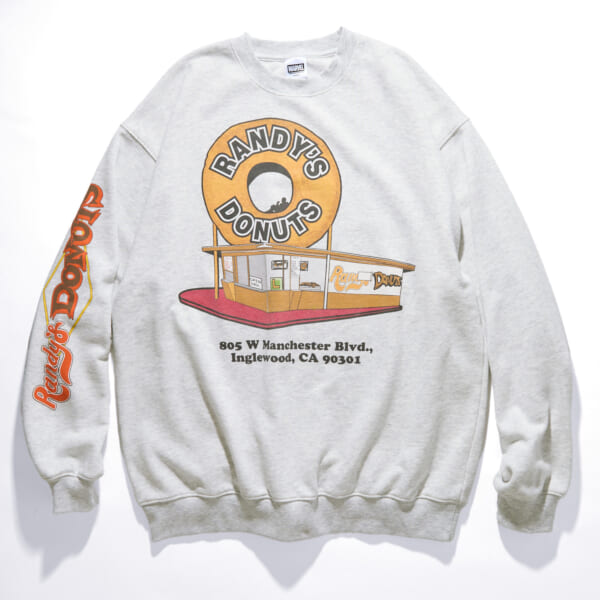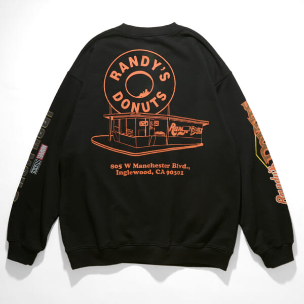 今回のコラボレーションでは、そんなドーナツ型サイン看板に、アイアンマンが座ってドーナツを食べるあの名シーンをフィーチャー。11.5オンスの裏パイルで仕上げたオリジナルボディを採用したスウェット3型、100%USAコットンでほどよくざっくりとした生地感、大きめのアームホールに適度なルーズシルエットの丸胴、シングルステッチが印象的なオリジナルボディを用いたTシャツ3型の背面にプリントであしらった。
