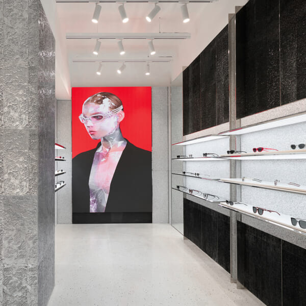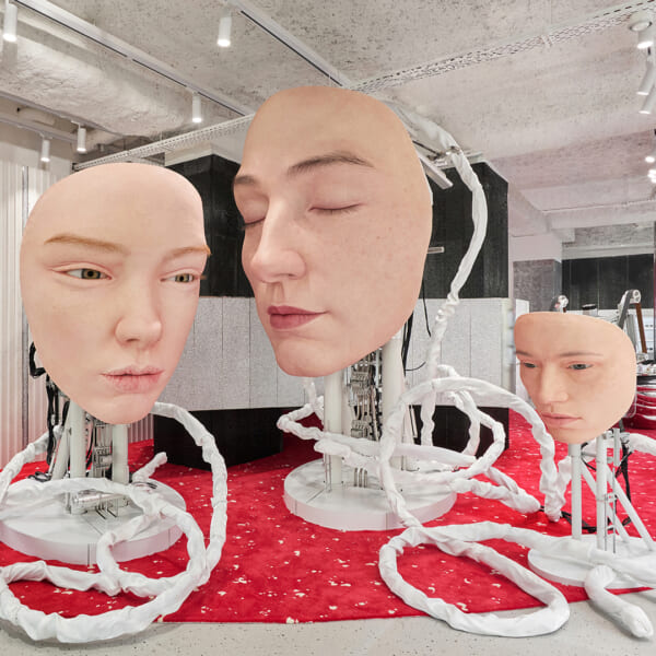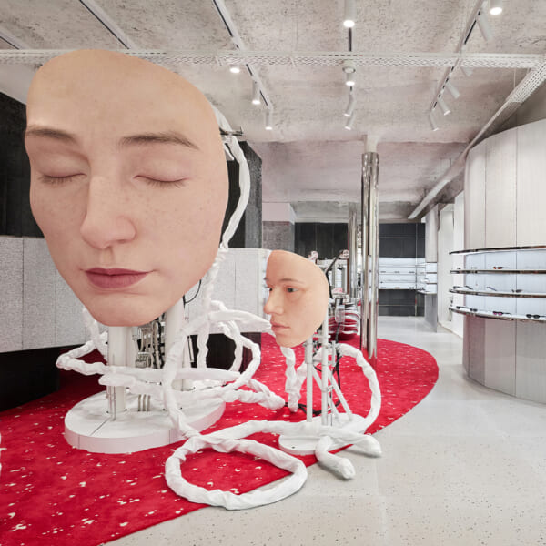 ストア中央には、〈GENTLE MONSTER〉のインハウス ロボティクス ラボで制作された“ジャイアント ヘッド キネティックオブジェ”を配置。両目を静かに閉じて物思いにふけるような表情を浮かべた顔、その両側に配されたより大きな顔と小さな顔が優雅に動作し、人間の思考や感情、そして人間同士の関係を表現している。