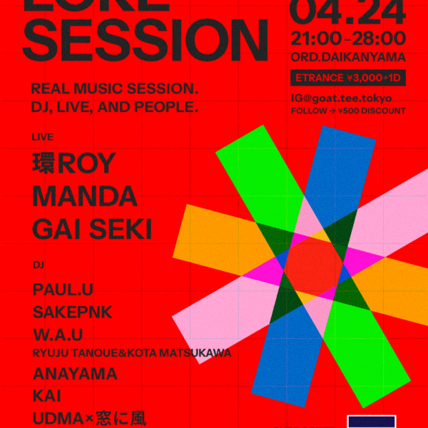 このたび、開催されるカルチャープロジェクト LORE by GOATは、音楽セッションとカルチャーマーケットを展開する2日間で構成。1日目は、環ROY、MANDA、GAI SEKIをライブアクトに招いた音楽セッションを開催。DJには、PAUL.U、SAKEPNK、W.A.U(RYUJU TANOUE & KOTA MATSUKAWA)ら全7組を招聘した。