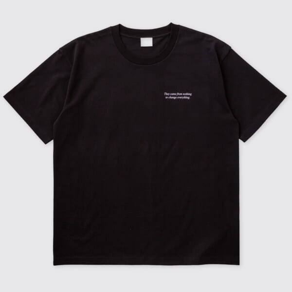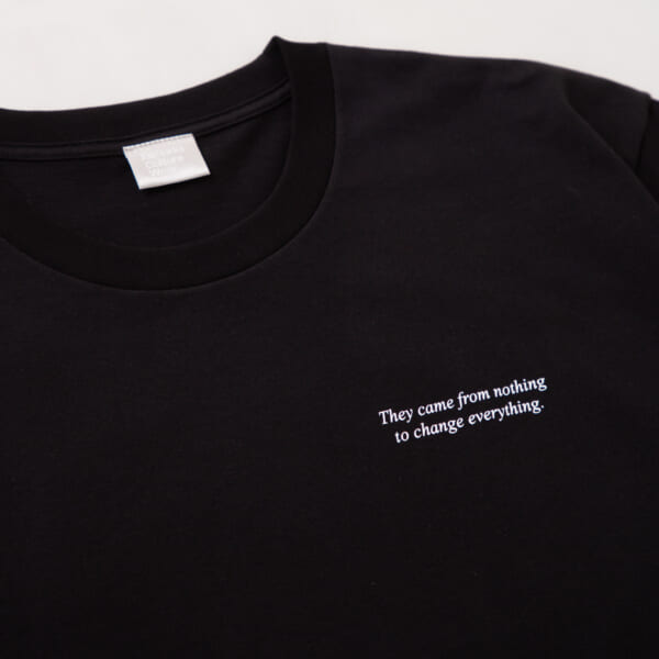 もう一方は、ボディ・生地はロゴTシャツと同じものを採用し、フロントには当時の映画公開時のコピー “They came from nothing to change everything.”のタイポグラフィをシルクスクリーンプリントで表現。バックには、夜のダウンヒルシーンの幻想的な街並みがボディに溶け込むよう、Tシャツの生地色を活かしたブラックマジックのインクジェットプリントを施した。