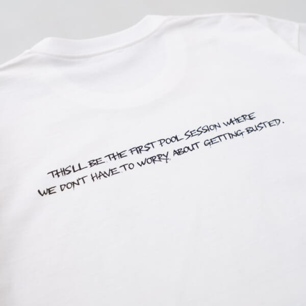 ひとつ目は、劇中の時代背景を踏まえたシルエットに、ステッチを排した衿リブが印象的なボディを採用。生地には、厚み・質感・柔らかさのバランスにこだわった上質な綿天竺を使用した。フロントにはヴィンテージのひび割れ感をサンプリングしたシルクスクリーンプリントを、背面には手描きのニュアンスを活かしたハンドドローイングタッチのタイポグラフィをレイアウトすることで、表情豊かな1枚に仕上げている。