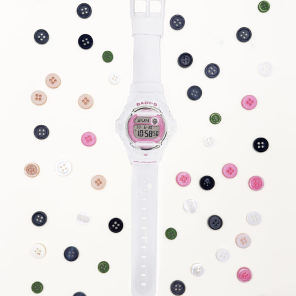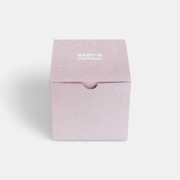 柔らかなピンクの文字盤と、クリーンなホワイトのケース&バンドのコントラストが、明るく軽やかな印象を演出。裏盤には〈Madhappy〉のロゴを刻印し、LEDバックライトを点灯させるなど、LCDディスプレイ上に〈Madhappy〉ロゴのシルエットが浮かび上がる特別仕様となっている。本コラボレーション限定のカスタム・コーブランディングパッケージも付属。