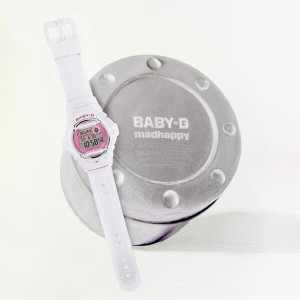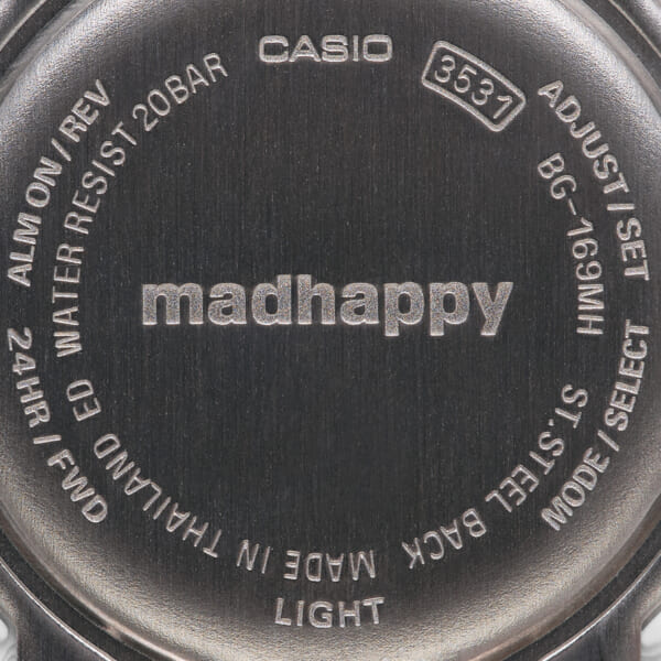 今回のコラボレーションでは、レトロフューチャーなデザインで知られるBG-169をベースにした特別仕様モデルを制作。BABY-Gが誇るタフネスと自己表現の精神を軸に、〈Madhappy〉の“楽観主義”という視点で再解釈し、ノスタルジーと前進するエネルギーの融合を表現した。