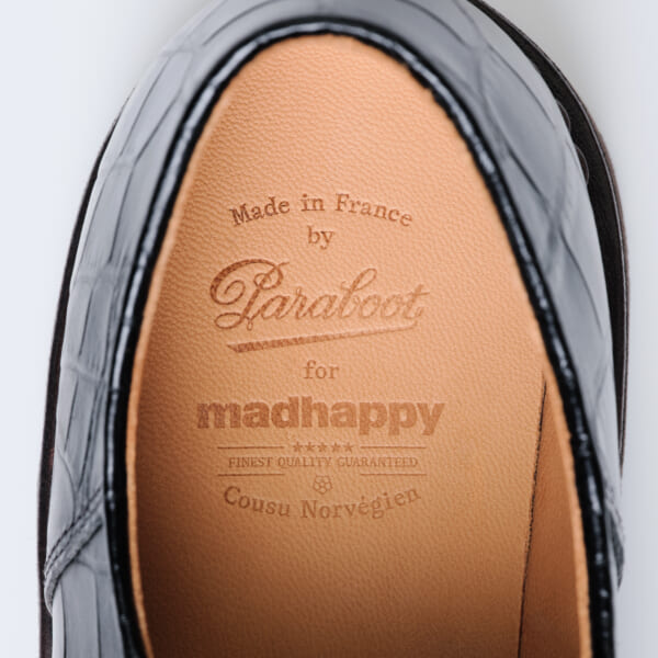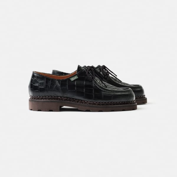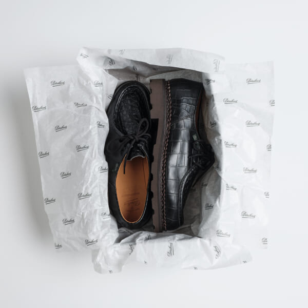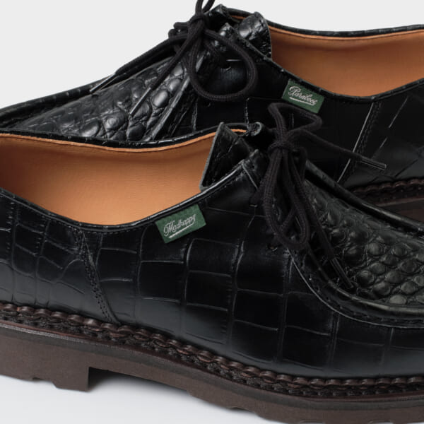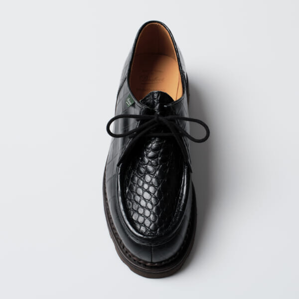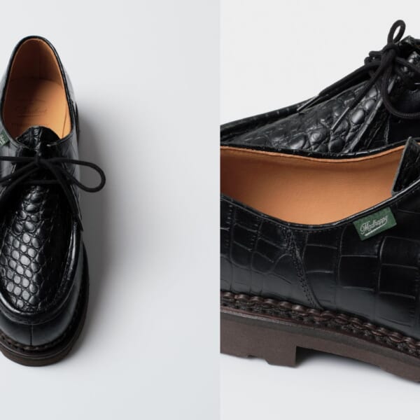 今回のコラボレーションでは、〈Paraboot〉のアイコンであるMichael(ミカエル)を、プレミアムなクロコダイルエフェクトレザーで再解釈。ブラックのカウレザーをベースに、アッパー全体へ型押しを施すことで、視覚的な奥行きと存在感を演出した。また、内部にはシープライニングを使用し、快適性と高級感を両立した仕上がりに。