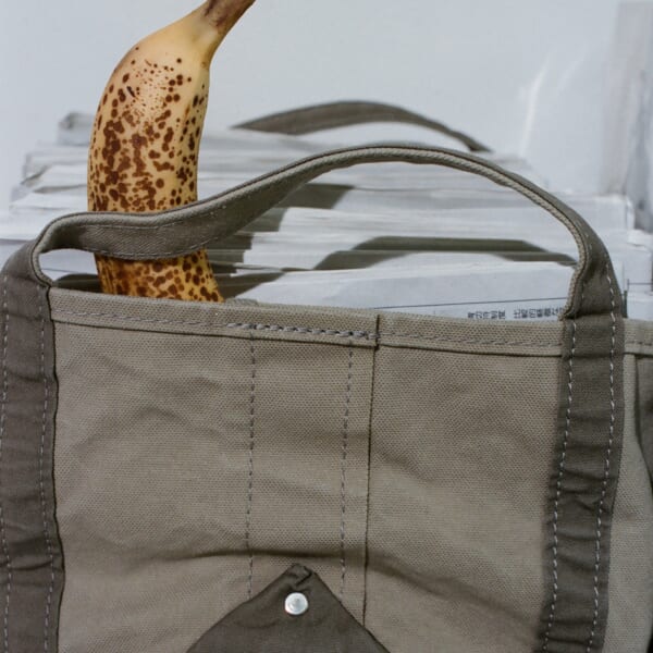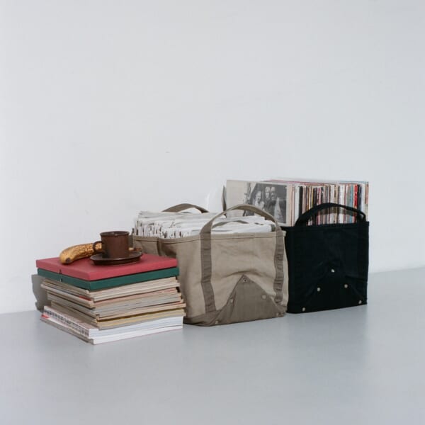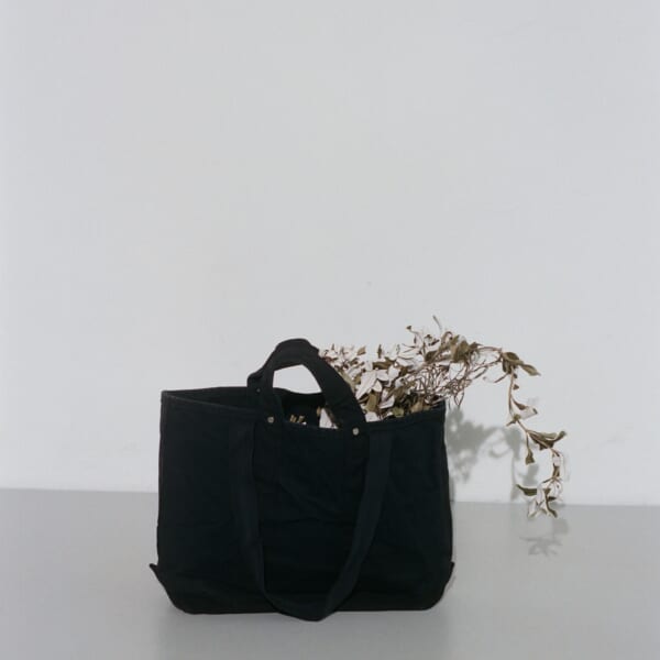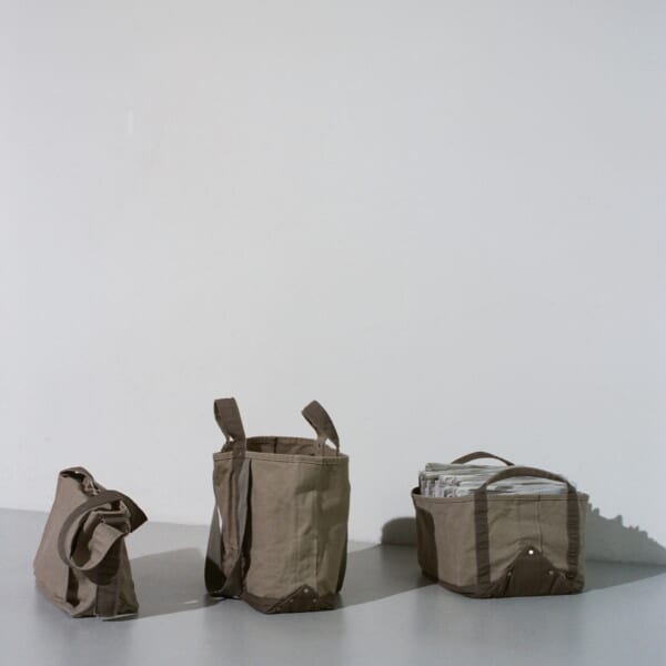 アイコン的存在であるBOOK TOTEは、三角の外マチにリベットをオン。全アイテムを通して使われているキャンバス生地は製品洗いを施し、長年使い込んだような風合いに仕上げた。
