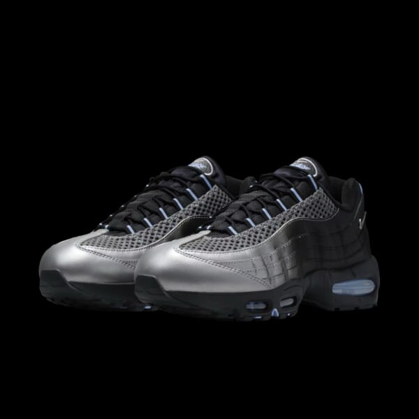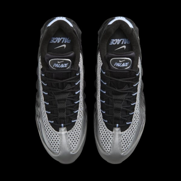 今回のコラボレーションの目玉となるのは、〈PALACE SKATEBOARD〉仕様にアレンジされた〈Nike〉Air Max 95。メタリックシルバーのレザーを採用したアッパーは、ヒール部分から前方にかけてブラックのスプレーを吹きかけたようなデザインに。また、随所にスカイブルーのパーツをあしらうことで、クールな印象の配色にアクセントを加えている。