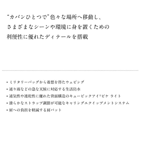 ミリタリーバッグから着想を得たモールシステム、3層構造のナイロンタフタ、通気性や速乾性に優れた背面構造の“キュービックアイ®︎”ピケ ライトを搭載していることにより、通り雨などの急な天候、気温の変化への対応も可能に。さらに、ワンハンドのワンアクションで滑らかな調節が可能なキャリングエクイップメントストラップ、肩への負担を軽減するショックアブソーバーを搭載したショルダーパッドをあしらい、さまざまなシーンや環境に身を置くための利便性に優れたディテールを多く取り入れた。
