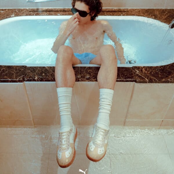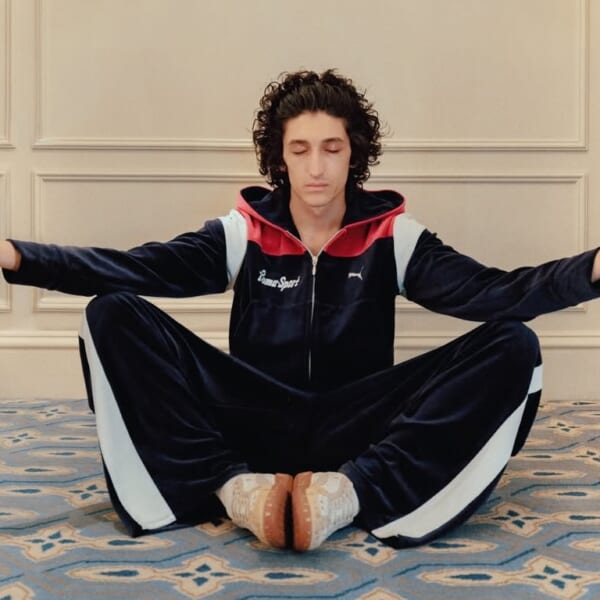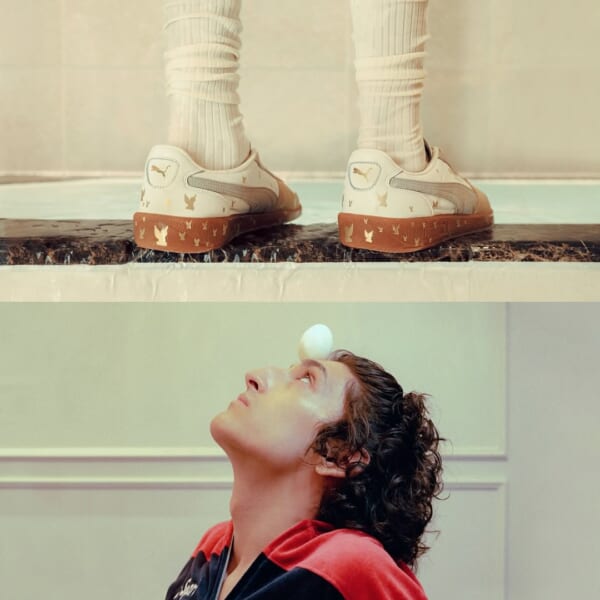 今回のコラボレーションの目玉となるのは、トレーニングシューズとして1980年代初頭に誕生した〈PUMA〉のPALERMO(パレルモ)をベースに採用したコラボモデル。上質なホワイトレザーで構成したアンダーレイには、ベージュ、そしてソフトグレー纏ったスエード製のオーバーレイを合わせ、ソフトな表情を演出。モデル全体にあしらわれた天使のアイコンは、泥跳ねをイメージしているという。さらに、ショート丈とワイドシルエットで再解釈したトラックジャケットとパンツ T7も登場。