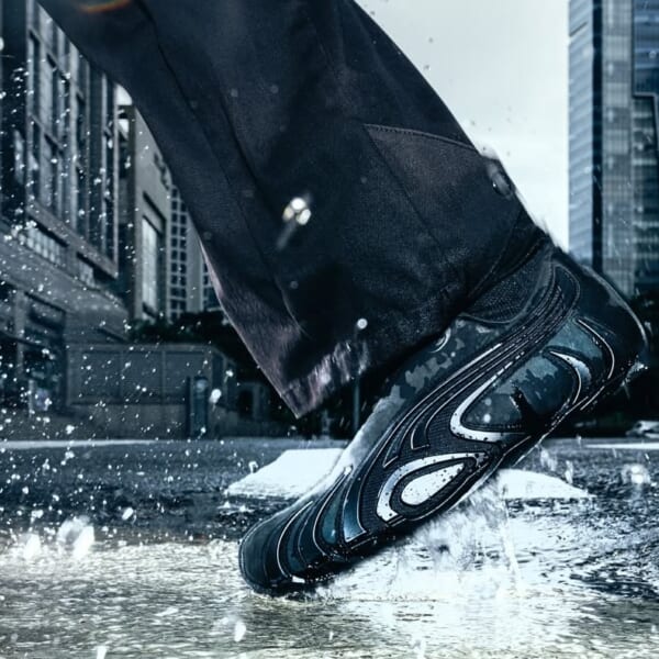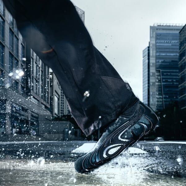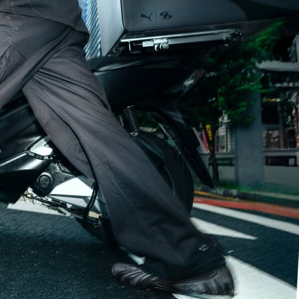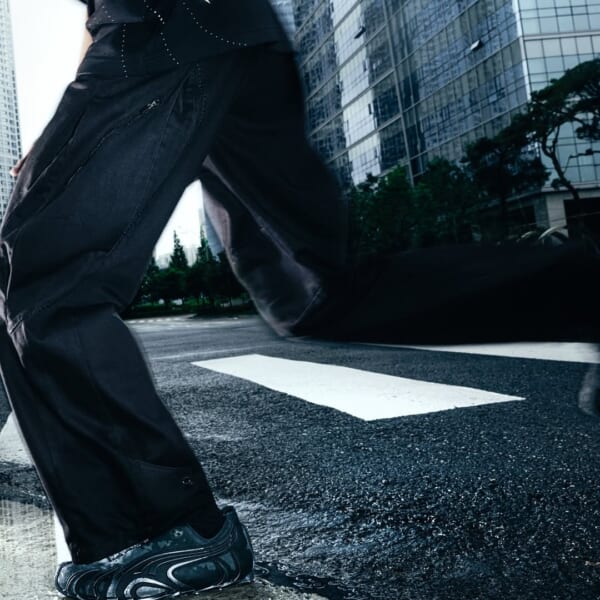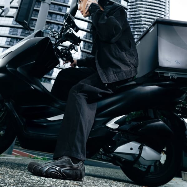 “FULL THROTTLE”と題した今回のコラボレーションでは、〈PUMA〉のアイコニックなシューズ Mostro(モストロ)とTalon(タロン)の2モデルを再解釈。スエード素材でアッパーの大半を構成したMostro Cageは、マットな質感のスパイクソールを合わせて洗練された印象を演出。一方、Talon OGは、キャンバスやラバー、ヌバックを掛け合わせたたオールブラック仕様で、〈SAN SAN GEAR〉らしいフューチャリスティックな要素を加えている。