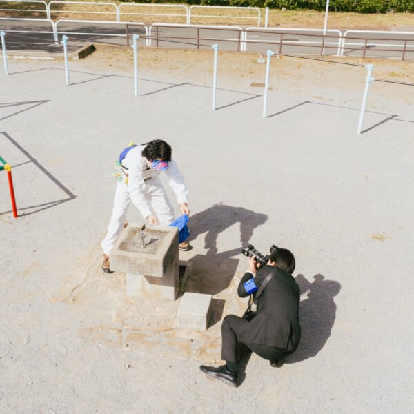 会場には、白いつなぎ姿のキャラクターに扮し、街中を駆け回るくるまを、加賀が追いかけながら撮影した作品群が並ぶ。さらに、写真家・武井宏員が捉えた2人の姿や、くるまを撮影する加賀の姿もあわせて展示。展示全体を通して、作品だけでなく、2人の関係性までもが垣間見える構成に。