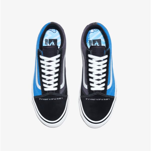 アッパーには、ブルーとグレーの左右パネルで異なるカラーを配し、スケートカルチャーを取り巻く空とアスファルトを表現。プレミアムスエードを用い、立体感のあるデボス加工を施すことで、印象的な佇まいを演出した。フォクシングテープには、トリックを決める際のスリルに着想を得て、“一か八かの勝負”をサイコロに例えたチェッカーボード柄をプリント。