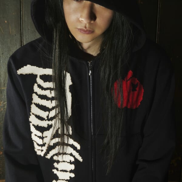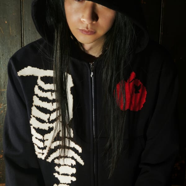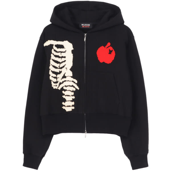 〈M A S U〉とのコラボレーション第2弾では、両者が培ってきた象徴的なデザインや素材を融合し、その魅力を新たな形で再構築した3型を展開。〈Yohji Yamamoto POUR HOMME〉2011年秋冬コレクションに登場したニットをオマージュしたBONE AND APPLE ZIP-UP HOODIEは、当時ニットに用いたデザインをレザーカットによるメルトンアップリケで新たに表現。カジュアルで現代的な〈M A S U〉のアイコニックなフーディへとアップデートした。さらに、リンゴのアップリケには〈M A S U〉のアイコンである天使のロゴを配置し、コラボレーションならではの特別なデザインに。