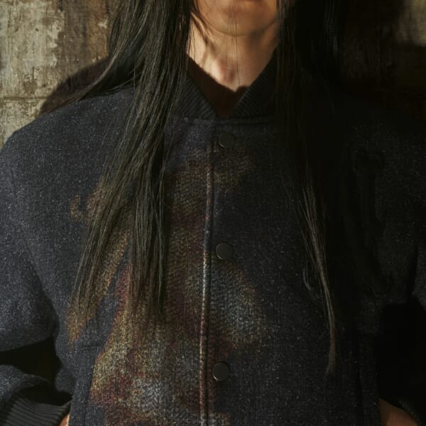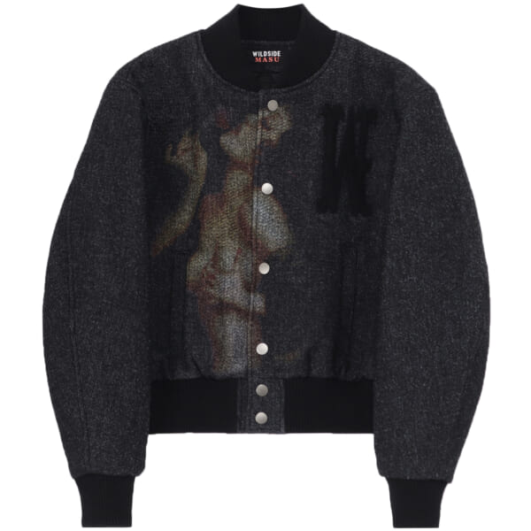 WOMAN PORTRAIT VARSITY JACKETは、同じく〈Yohji Yamamoto POUR HOMME〉2011年秋冬コレクションに登場したコートに着想を得て、インパクトのある女性のグラフィックを前面にプリント。左胸には〈M A S U〉のイニシャル “M”を逆さにし、WILDSIDEのイニシャル “W”を特別に表現した。加えて、プリント生地とメルトン生地をニードルパンチで融合。繊維の絡みから生まれる独特な立体感、そして重厚感とアート性のある表情が際立つ1着となっている。