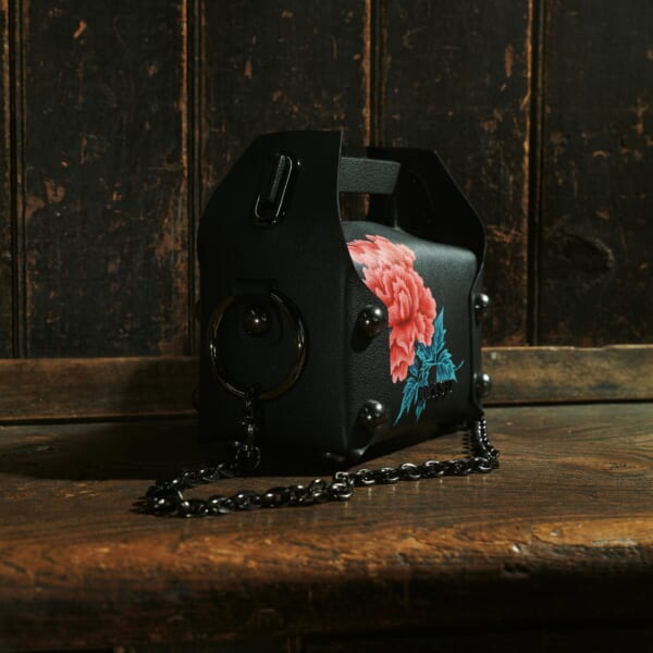 FLOWER PRINTED LEATHER CAKE BAGは、前回のコラボレーションで好評だったヨウジヤマモトのアイコニックな牡丹の花のグラフィックを、〈M A S U〉のシグネチャーアイテムである“CAKE BAG”へ落とし込んだアイテム。また、金具をブラックニッケルに変更することでモードなデザインを融合させた。