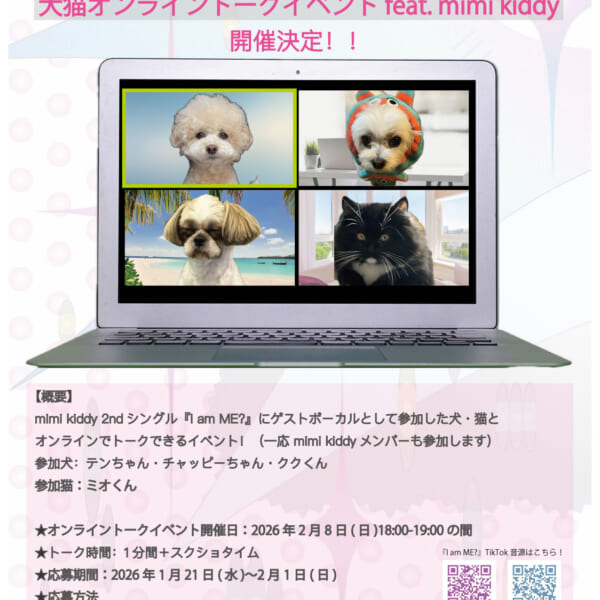 加えて、今回のリリースを記念し、犬・猫とオンラインで会話できる<犬猫オンライントークイベント feat. mimi kiddy>の開催も発表。“I am ME?”のレコーディングに参加した犬3匹(テンちゃん、チャッピーちゃん、ククくん)と猫1匹(ミオくん)と、オンラインでトークできるという前代未聞のイベントに。もちろん、イベントへはメンバー本人たちも参加予定だ。
