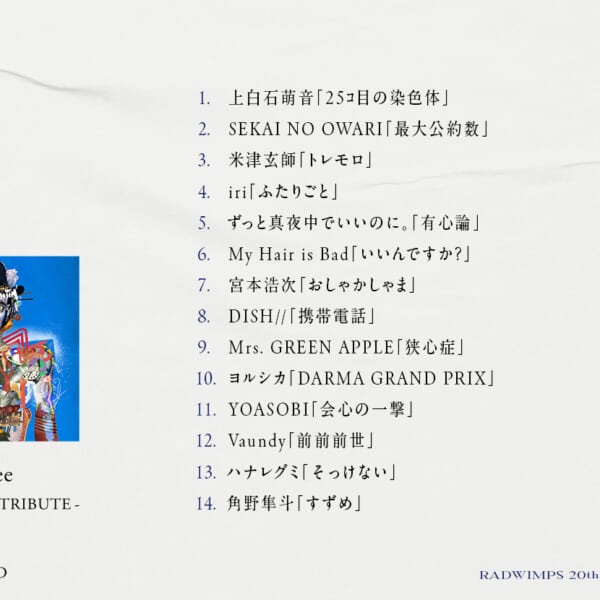 RADWIMPSが20周年記念のトリビュートアルバム『Dear Jubilee -RADWIMPS TRIBUTE-』をリリース sub3-9
