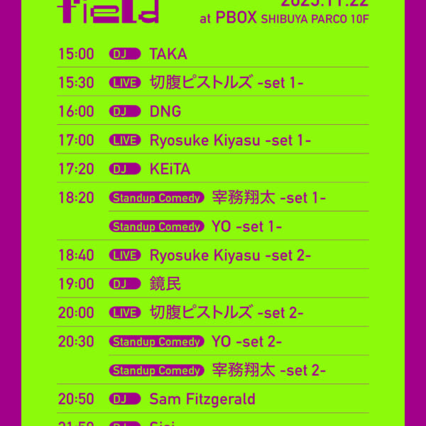 それぞれが普段とは異なる一歩を踏み出し、分断され整理されてしまったカルチャーにカオスを取り戻し、混沌のなかで新しい繋がりや意識を持つきっかけとなる場所 “field”。2024年11月に始動した本イベントは、インドネシア・ジャカルタを拠点に音楽/ファッション/アートの3つのカルチャーを軸に活動するカルチャーコレクティブ ZODIACを招聘し、<field – ZODIAC TAKEOVER PARCO>を開催したことも記憶に新しい。